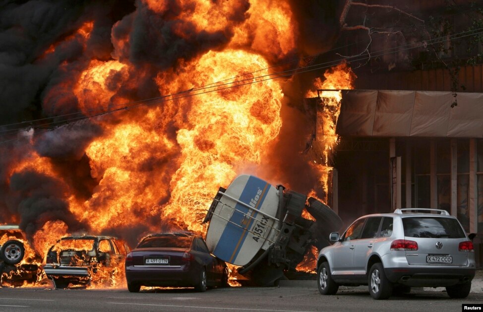 At dusk I continue walking along until I come to be under a highway overpass in a industrial park area. Suddenly, I see a gasoline hauling semi-trailer tanker truck speeding toward us. The truck is swerving from side-to-side as it snakes it's way down the street. When it is exactly under the bridge it crashes on it's left side onto the pavement and collides with a support pillar, and bursts into flames! I hear several women off to my left scream and come running toward the accident. We watch in horror as it bursts into flames. Then after about a minute I see a man and a woman rise up out the right side passenger door! They are burning up so badly that their flesh is melting. They are screaming loudly in pain. The woman is trying to lift the man out of the cab by his right arm. They both die being consumed by the flames. It was such a traumatic sight that it physically shook me back into an awake consciousness state.